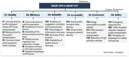 The shortlist of indicators was then deliberated in accordance with the possible available services from projects under the ITS master plan and current ITS systems in BMR and finalized by removing the redundant and indirect indicators related to APTS. Finally, 21 prospective indicators were determined within the six dimensions to represent APTS development in BMR. The proposed hierarchical dimensions and indicators are shown in Figure 2.
