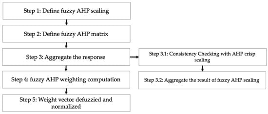 However, before calculating the fuzzy AHP weighting, the consistency ratio () is required to compute the consistency of the constructed matrix verification. Thus, the AHP crisp scale from Table 5 is replaced to calculate the consistency index () and , as shown in Equations (3) and (4), respectively [58].