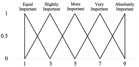 Then, the intensity importance scaling is represented by the fuzzy triangle member (FTM) as shown in Equation (1) and Table 5.