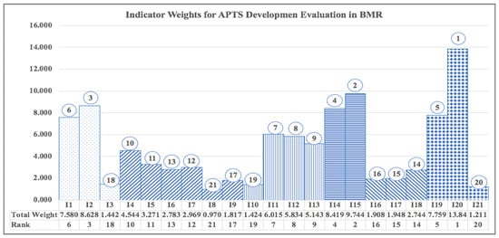 The fuzzy AHP weighting step was repeated to acquire each indicator weight within each dimension. Regarding the hierarchy of the proposed indicators, the total weight of each indicator in a level with respect to a dimension was obtained by multiplying by the weight of that dimension [56]. Then, the priority of each indicator compared to that of others was ranked to represent the significant measurement of APTS development in BMR from the experts’ perspective. The final weights of the proposed indicators for APTS development in the BMR are presented in Table 6 and Figure 5.