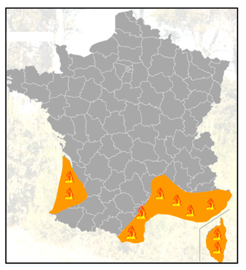 - Ganteaume, A.; Barbero, R. Contrasting large fire activity in the French Mediterranean. Nat. Hazards Earth Syst. Sci. 2019, 19, 1055–1066. [Google Scholar] [CrossRef]
