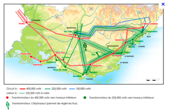 The transmission network operated by RTE in PACA covers 5662 km of aerial transmission lines and 595 km of underground transmission lines. Two hundred substations are installed, providing a transformation capacity of 17,833 MVA (Figure 5). In terms of power transmitted through the network, PACA consumes around 37 GWh per year (figures of 2015) while it produces around 12 GWh. The power demand (higher and lower peaks in 2015) varies between 2836 MW and 8006 MW in the region. The main assets that will be investigated for this CI are: production units (power plants), transmission and distribution lines (both aerial and buried), substations, and control center.