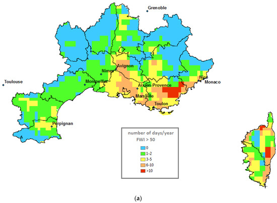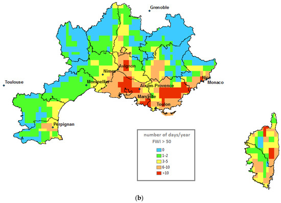 (a) Climatic model MPI/RCP8.5/number of days/year Fire Weather Index (FWI) > 50: period: 2006–2015; (b) Climatic model MPI/RCP8.5/number of days/year FWI > 50: period: 2036–2045.