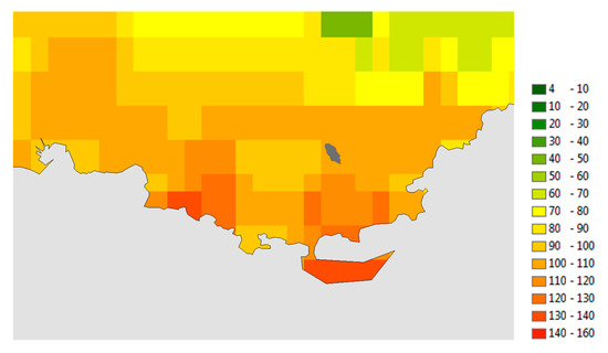 The evolution of critical meteorological parameters was calculated for 2006–2015 (present day climatology) and 2036–2045 periods with two climate scenarios: RCP4.5 and RCP8.5. Daily data-sets for the extended fire seasons (1 May–31 October) were created with an 8 × 8 km2 spatial analysis. Figure 7 presents the annual averaged number of days with a FWI greater than 50. This number was considered to represent very high risk for large fires, and was derived after personal communication with the related stakeholders.