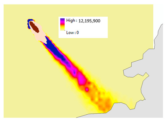The FireTactic output then fed the Fire Emission Production Simulator (FEPS), a USDA Forest Service Pacific Wildland Fire Sciences Lab product [46], designed to manage data concerning consumption, emissions and heat release characteristics of prescribed burns and wildland fires. This produced hourly estimates of PM2.5 including burned areas, plume rise from the resulting fire radiative power. The hourly emissions were fed into the Hybrid Single Particle Lagrangian Integrated Trajectory Model (HYSPLIT) computer model [47,48] that is used to derive the concentration of smoke for the area of interest for a period of 12 hours from the fire-starting time. Figure 9 displays a snapshot of the produced smoke concentration (in μgr/m3), which was used to drive the impact models.