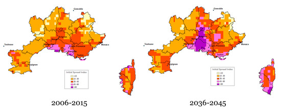 Average annual Initial Spreading Index for present and future RCP8.5.