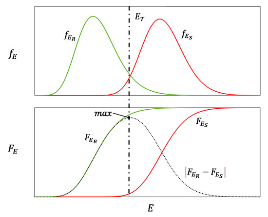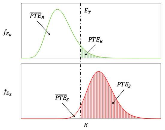 Therefore, the value of the threshold E T is chosen as the value of E for which the PDFs of the damage sensitive feature in state R and in state S present the same value:   f E R ( E ) = f E S ( E ) . Among the possible solutions of Equation (11), the value corresponding to the absolute maximum of the numerator in Equation (9) is chosen to increase the sensitivity to damage. The criterium used to select the threshold is illustrated in Figure 2. This value of E T changes with state S , namely, it increases with damage. The denominator of Equation (9) is the area to the left of the threshold E T that increases with the threshold, therefore with damage. This means that the damage index becomes less and less sensitive at the increase of damage. To make the damage index more effective, in the modified version of the SIDI proposed in this paper, the denominator of Equation (9) is changed in P T E ¯ S ( E T ) . This value decreases with damage, thereby increasing the sensitivity to damage of the damage index. Thus, the Modified Statistical Interpolation Damage Index (MSIDI) in the inspection state S is defined as follows: