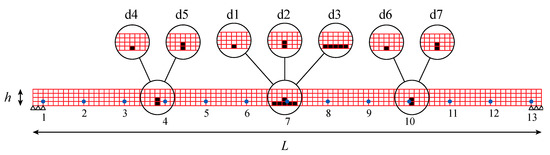 Five single damage types (d1 to d5) are simulated, as displayed in Figure 3. Damage is modelled through the removal of one or more finite elements that entail a local reduction of the flexural stiffness. Damage types d1–d3 present a damage located at midspan, whereas for Damage types d4–d5 and d6–d7, damage is concentrated at ¼L and ¾L, respectively. A total of nine damage scenarios (DS) are simulated, considering combinations of single damage type according to Table 1.