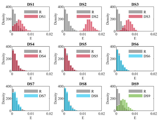 This section describes the results obtained by applying the proposed damage localization method on the numerical benchmark. The instantaneous values of the first mode shape are used to compute the interpolation error as described in Section 3.2. Figure 5 displays the distributions of the instantaneous values of the damage feature at location n. 7, midspan, for the different damage scenarios. The results in Figure 5 are obtained considering the configuration C2, where sensor 7 is placed within the boundaries of the subsets. The number of available samples of the interpolation error in each scenario is equal to the sampling frequency (50 Hz upon downsampling) times the length of the signal (400 s). Therefore, for each scenario, 20,000 ( 50   Hz · 400   s ) samples of the interpolation error E are estimated. In scenarios DS1–DS3 and DS9, damage is located at midspan (location 7), and, as shown in Figure 5, for these scenarios, the distribution of the interpolation error shifts toward the right of the plots consistently with the increase of the damage feature at this location.