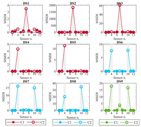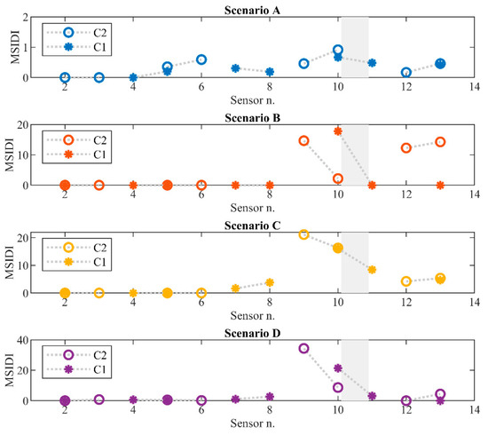 Figure 12 presents the values of the MSIDI computed for the two sensor subset configurations and different damages scenarios. In Figure 12, the MSIDI is set to zero in the locations in which it presents negative values. The highest values of the MSIDI are reached at sensors 9–11, which is in the proximity of the lowered pier. As for configuration C2, it is noted that sensor 11 is located at the external knots of subsets 3 and 4; therefore, the MSIDI cannot be estimated in that location. For this reason, the highest values of the damage index are in the area surrounding sensor 11.