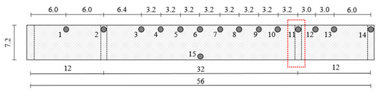 Two main types of damage have been inflicted to the structure, namely, (i) the cut and progressive lowering of the northwestern pier and (ii) the cut of several tendons in the deck. The first type of damage was intended to simulate settlement and the second one to simulate the loss of prestress. During the simulation of damage, the dynamic response of the structure has been continuously recorded at 500 Hz using 15 three-directional FBA-23 force balance accelerometers from Kinemetrics deployed along the bridge deck according to Figure 8. In particular, the sensitivity of the sensors is 2.5 V/g under a full-scale range of 1 g, and they have a resolution of 10−6 g. Raw data were logged using a 16-bit analog-to-digital converter (ADC).