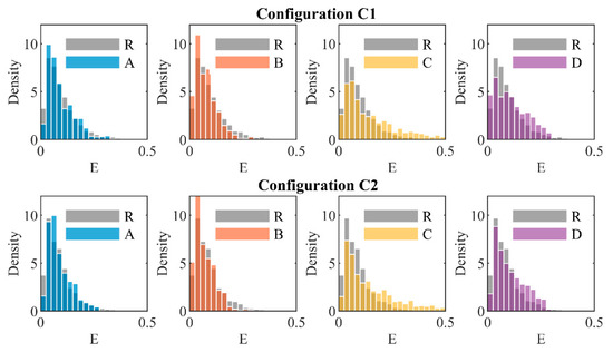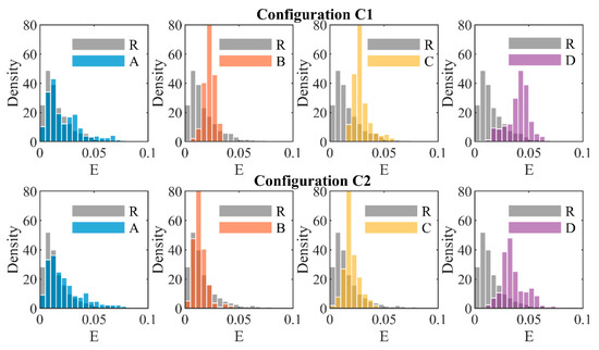 This section describes the results obtained by applying the proposed method on the S101 bridge. The instantaneous mode shapes are used to compute the interpolation error as described in Section 3.2. Figure 10 displays the distributions of the instantaneous values of the interpolation error at location n. 10, close to the settled pier, relevant to the different damage scenarios. The results in Figure 10 are computed considering the two subsets of sensor subset configurations displayed in Figure 9. For each damage scenario, 16,500 ( = 50   Hz · 330   s ) samples of the interpolation error E are estimated. Instead, 82,500 ( = 50   Hz · 1650   s ) samples of the interpolation error are available in the reference state. It is observed that the distribution of the interpolation error shifts toward the right of the plots as the severity of damage increases.