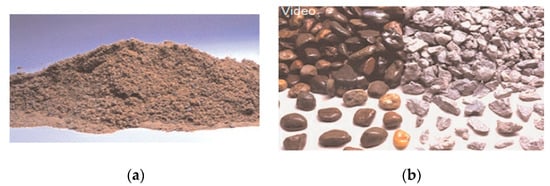 Figure 1. (a) Fine aggregate (0–5 mm); (b) coarse aggregate (9.5–37.5 mm) []. - (B)