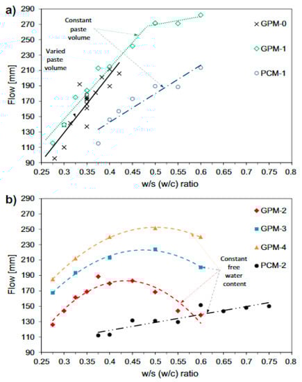 The effectiveness of w/s ratio and w/c ratio on the flow of geopolymer mortars (GPM) and Portland cement mortars (PCM) mixes: (a) the constant past value; (b) the constant free water content [].