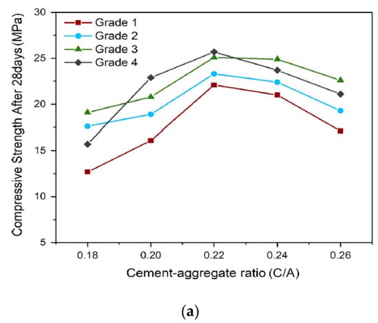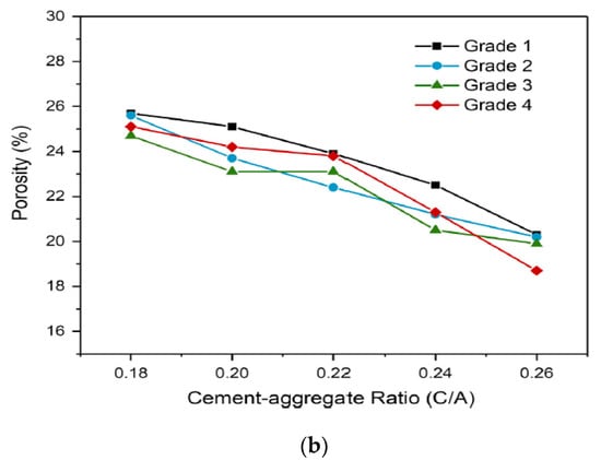 Regarding the porosity of PCC, this concrete property is typically in the range of 15–25%, which is a larger amount than the concrete with higher density. In fact, the high porosity can lead to structural and environmental defects, especially in the case of concrete strength []. Therefore, Wang et al. [] firstly presented the comprehensive experimental investigation in terms of the effect of material proportion, such as cement–aggregate ratio by mass (C/A) on porosity and determination of optimum value for PCC compressive strength. The second stage was the choice of FA as supplementary cementitious material in order to replace PP at the optimum C/A ratio determined in the previous step. Experimental results showed that C/A and FA percentage as PP replacement have considerable influence on the concrete properties (Figure 3).
