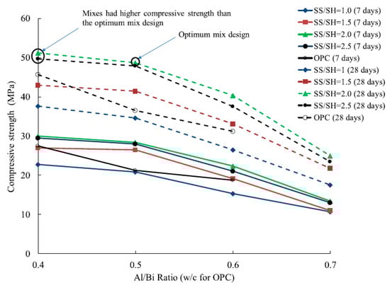 It is essential to note that the presence of reactive Si in the process of alkali activation has an effective role in the development of compressive strength, particularly for a solution with highly alkaline content. Indeed, Si ions consumed in this chemical activation process led to the formation of Si-O-Si as polymeric chains, which is related to alkaline material-to-binder ratio. Further increases of alkaline material-to-binder ratio beyond the specific value, for instance, 0.500 in the study of Ibrahim et al. [], can result in the negative effects on concrete strength. However, the role of SS/SH as the other portions of this phenomenon cannot be ignored as it is worth to point out that the increment of SS/SH is effective for increasing compressive strength, provided that sufficient Si ion is available for the chemical process. Otherwise, a decrease in strength can be seen while reducing binder content due to the increase of alkaline material-to-binder ratio resulting in the depletion of Si ions in the system [].