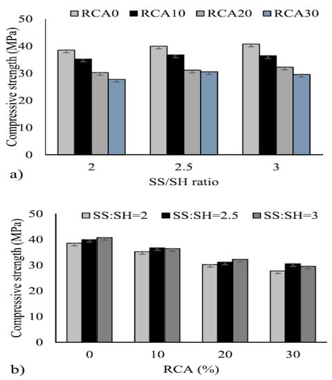 Effect of (a) SS/SH ratio; (b) recycled concrete aggregate (RCA) replacement on the compressive strength [].