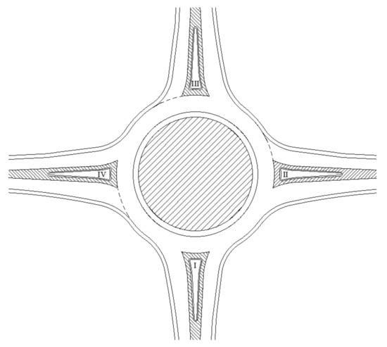 The geometrical layout of the 4-arm urban roundabout considered in this study is given in Figure 1. In the examined junction, the four approaches are labeled with Roman numbers from I to IV in a counter-clockwise direction from the southern arm.