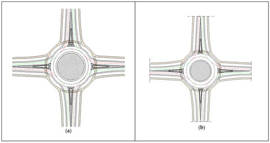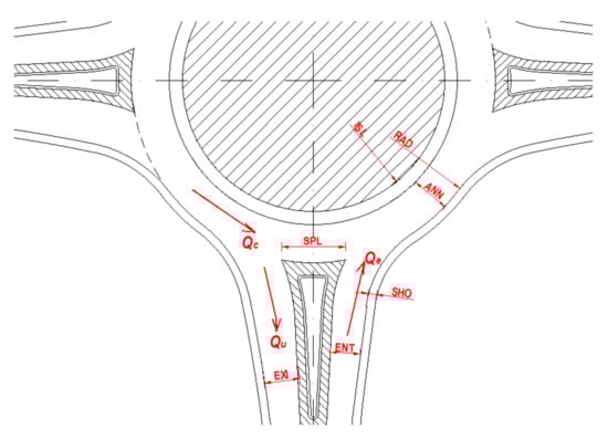 Geometrical characteristics of the examined symmetrical single-lane roundabout are listed in Table 1 according to the nomenclature in Figure 2.