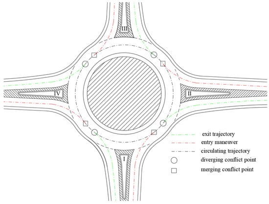 Vehicles and bicycles can perform three maneuvers in all the layouts taken into account: straight ahead, right turn, and left turn []. All the trajectories of users start when the head of the vehicle is at the yield line of the entry arm (entrance stage) and end when the rear of the vehicle leaves the circulatory roadway (exit stage). In this study, the authors assume that all the vehicles move as a geometric point (i.e., their center of gravity) in the center of the lane [], along both the arms and the circulatory roadway. Cyclists share the same driving spaces of the motor vehicles because the circulatory roadway and the carriage width do not permit a safe circulation on parallel alignments. In a single-lane roundabout, each arm is characterized by a pair of conflict vehicle-to-vehicle points (), identified as the common point of both bike and motor vehicle trajectories. One of these points is related to the merging trajectories (), while the other refers to the diverging ones (). Obviously, each roundabout has in total eight . In Figure 3, the four merging are identified by squares in the circulatory roadway, while the four diverging ones are labeled by circles.