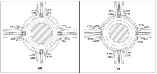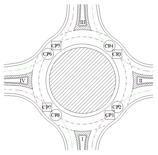 Having regarded the starting layout in Figure 4 and its geometrical characteristics in Table 1, Figure 4 represents the position of each examined CPi (CP1 to CP8). The entry maneuvers are red, the exit maneuvers are in green and the circulating trajectories are in black.