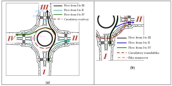 - flows in CPi vary: in L0 they refer to a circulating flow (both motor vehicles and bikes) that is represented by the red-dotted circle in Figure 6a and a maneuvering flow (in Figure 6a only the maneuver trajectories from I are represented), while in L1 and L2 they respectively refer to both the bike circulating flow and a motor vehicle maneuvering flow (e.g., intersection between the red dotted circle and the blue-red-black motor vehicle trajectories in Figure 6b), and a bike maneuvering flow and the motor vehicle trajectories (e.g., conflicts between the orange maneuvers of bikes and the black and blue trajectories of motor vehicles along I and II, respectively, in Figure 6b).