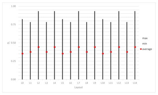 The values of in Table 15 are represented by red points in Figure 8, where it is possible to evaluate the variability of Di for each examined layout: the black lines in the average-maximum-minimum chart show the spread of the calculated Di values for each Li.