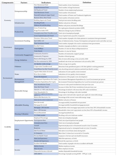Each ranking system has a variety of factors to rank a city. Intelligent cities use the indicators Environment and Urbanism, Governance and Public Service, Economy, and Industries, Informatization and Innovation Human Resource []. Livable ranking system access cities based on safety, economy, environment, education, health, transportation, recreation, population density and public utility []. Sustainable cities index uses the factors people, planet, and profit []. Mohanty et al. used components like smart citizen, smart infrastructure, smart building, smart transportation, smart energy, smart health care, smart technology, smart governance, and smart citizen [].