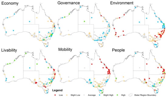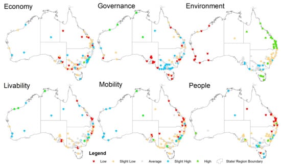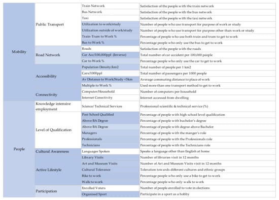 Human capital, which is not just the population but a set of skills, knowledge, capabilities, and the productive attributes embodied in people [], is the main focus of regional development in addition to the services []. This always for ways to create new and improve existing services [,]. The level of smart development is unbalanced in different cities, which makes it difficult to rank with those that are balanced []. As a plan to advance the smart city movement in Australia, Smart Cities Council have hosted an “Australian Smart Cities Awards” to recognize and encourage more smarter cities in Australia. Some of the improvements included free public Wi-Fi; training 3500 students in coding; connecting business to high-speed, high-capability networks; introducing smart bin and water meters, parking and sensors to monitor wildlife and waterways to create a more livable city, etc. [].