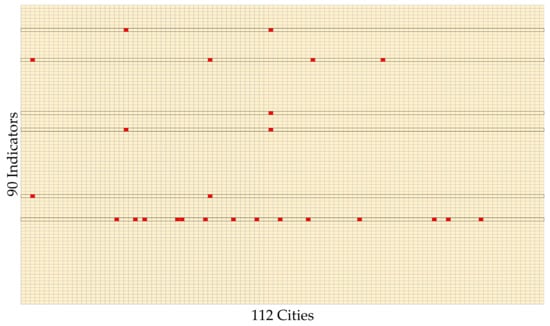 For the imputation of missing values, the first step involves the evaluation and temporarily removing the remaining data from the indicators with a missing value []. This allows the cities to be ranked with the equal data at the factor level. As a result, a total of six indicators scores are temporary removed for the comparison purposes (refer Figure 3). The next step involves clustering of similar behaving cities, where the indicators are grouped and treated to estimate a missing value. With missing indicator, the cities are grouped at factor level and are sorted in ascending/descending score order. This allowed to identify the cities with similar characteristics. The average value of similar performing cities can be used for the missing indicator of the target city. This process is repeated for each of the 26 missing values.