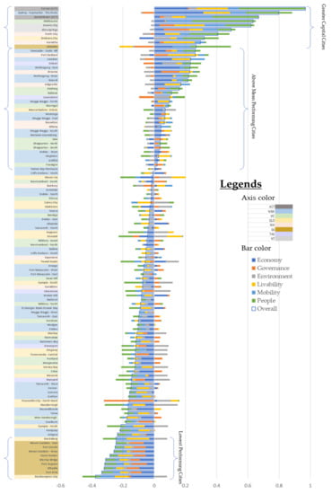 There are currently different concepts other than smart cites, which are used to rank cities based on various factors. The choice of indicators must be corelated to “city’s problems” for an easier reading of how cities rank when compared to others [,]. Such as studying the effect of energy and waste producers, air pollution, population growth, and livability conditions though a “well-balanced, integrated and socially equal communities” and job opportunities [,,,]. Batten ranked 50 cities to compare their environmental impact and financial stability []. The economist in its report ranked 120 cities for the years 2012–2025 by comparing their competitiveness mainly based on business, environment and the ability to attract talent and visitors []. Similarly, the global power city index, ranks 48 major cities based on their “comprehensive power to attract people, capital, and enterprises” []. Worawej et al. [] used a slightly different ranking approach by focusing on a single median class city instead of multiple cities. In the economist ranking system, eight factors are assessed; economic strength, physical capital, financial maturity, institutional character, social and cultural character, human capital, environment and natural hazards, and global appeal []. The importance of each factor was weighted by a percentage ranging from 5% to 30%. Sassen selected multiple indicators for global economic cities [].