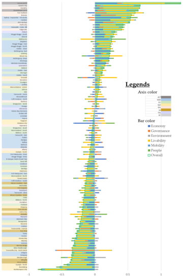 Oversimplification may occur when assigning same weightage to six components (economy, mobility, environment, people, living, and governance) of a smart city as it may not identify the real preferred cities. Yadav et al. [] concluded that applying an equal weightage “was not justifiable logically” for decision making process. Similarly, Bernardon et al. [] were able to identify the option that were best fit for remote controlled switches, whereas Yadav et al. concluded that the technique gives a “more optimistic value”. In case of smart city ranking, a weightage metric should be done as just adding up the measure will not produce meaningful data to represent the overall performance of cities [].