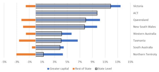 Australia is suffering from disproportionate population concentrations and vast distances []. The division between metropolitan and regional areas is causing societal, economic, and political issues [,]. Not only the internal migration but the immigrants from the other countries prefer to settle in metropolitan cities []. The high concentration of population in two of Australian cities, Sydney and Melbourne, is causing many administrative issues for Australian government [,,,]. These two cities are also the main hotspot for tourism. Australia is consisting of seven states/territory namely New South Wales (NSW), Queensland (QLD), South Australia (SA), Tasmania (TAS), Victoria (VIC) and Western Australia (WA), and the Northern Territory (NT) plus the Australian Capital Territory (ACT). Australian population is distributed extremely disproportional. For example, the populations of either of cities (Sydney and Melbourne) is more than the total population in all other states excluding the QLD that has almost same population as in Melbourne. The same disproportion of population can be observed within all states between their metropolitan cities (regional/state capital city and surrounding cities) and the remaining (regional) areas/cities.