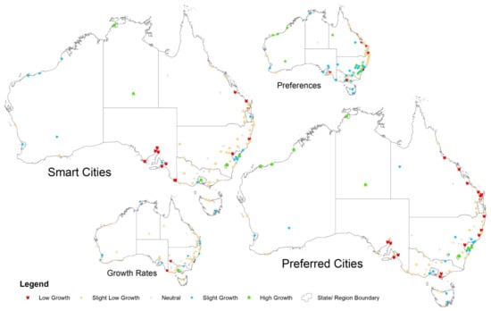 Due to the “dramatically” changing population of Australia, Graeme [] suggested for information technology development to be made, which will “tie people and industry” less to the major metropolitan parts of Australia. There is no doubt a link exists between what city people prefer to live in and how smart that certain city is. Anthopoulos and Fitsilis claimed that a competition between cities appears to transit to a smart competition with the modern developments []. Rolfe et al. [] identified the high salaries as an effective motivational factor for the workers to work in regional areas.