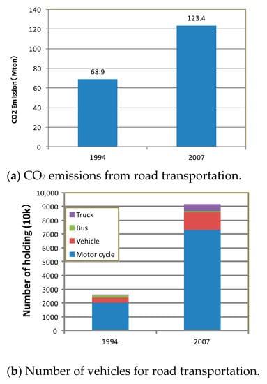 Global warming and greenhouse effects, including CO2 emissions, have been concerns since the 1970s. Figure 1 shows that transportation accounted for 14% of CO2 emissions worldwide in 2010, corresponding to 6.86 giga-tons [1]. Figure 2 shows that the volume of CO2 emissions doubled and the number of vehicles tripled in India between 1994 and 2007 [2]. As for India’s traffic condition, there is a great volume of traffic growing under its poorly developed transport infrastructure, there is heavy traffic congestion as a result of crowded traffic, and traffic accidents. Therefore, it is urgent to find out the reason for traffic congestion mechanism in order to deploy a low carbon transport system.