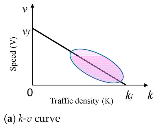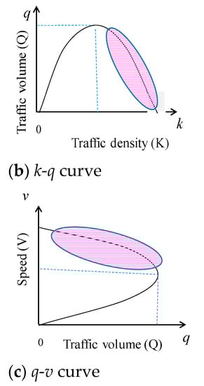 Figure 3 illustrates three fundamental traffic flow characteristics obtained using the traffic flow theory presented above, where the point of traffic congestion is marked in each graph. Traffic congestion occurs in high traffic density areas, and there is a critical traffic volume that represents a threshold between no congestion and the onset of congestion.