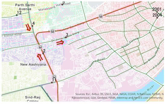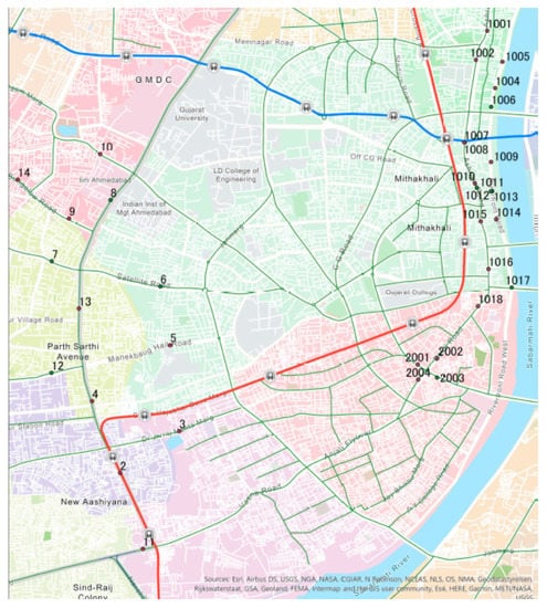 Figure 4 shows the three segments used for traffic data measurement. The left side of the group lies along a major road, 132 Feet Ring Road, which is monitored by CCTV No. 2 to 14. New shopping malls, restaurants, and business offices in this area are monitored by CCTV No. 1001 to 1018. A second group of CCTVs is located near the river area—the Sabarmati Riverfront. A third group of CCTVs is located at a major junction, namely, the Paldi Junction (CCTV No. 2001 to 2004), which is the end point of a flyover starting near CCTV No. 11. A metro is being constructed in Ahmedabad that comprises a north-south line and an east-west line. The partial operation of metro services began in March 2019, and phase 1 of the north-south line will be completed by 2023 [15]. Ahmedabad has had a dedicated bus rapid transit service or BRT since 2009, which has a 101-km operation with 275 buses [16].