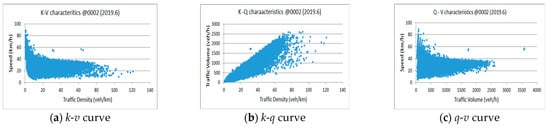 Figure 5 shows an example of fundamental traffic flow characteristics obtained from CCTV No. 2 for June 2019. It is difficult to determine traffic congestion from these curves. The traffic data presented in each graph are based on lanes, for example, a 100-vehicles/km (veh/km) traffic density corresponds to a 100 veh/km lane. CCTV No. 2 monitors two lanes.