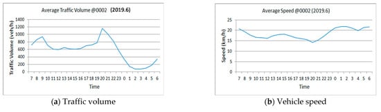 Figure 6 shows the variation in the traffic volume and average vehicle speed with time. The traffic volume peaks twice, in the morning and evening. Traffic congestion is clearly reflected in the vehicle speed. The traffic speed is lower in the evening than in the morning, indicating that traffic congestion is heavier in the evening than in the morning. Similar trends in the traffic flow characteristics are obtained at other locations.