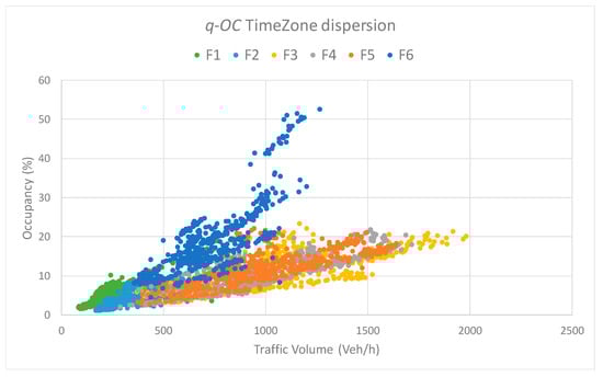 In the previous section, we see that there are some different condition changes between traffic volume and occupancy from Figure 7. This section describes a more detailed traffic congestion analysis, especially the difference between traffic volume and occupancy. Figure 8 describes the dispersion between traffic volume and occupancy. The number in the graph shows the hourly time when each traffic volume and occupancy are measured. Traffic congestion normally occurs at the over 15% occupancy level, and congestion occurs at the time frame between 20:00 and 22:00. In the morning, the relationship between traffic volume and occupancy is linear along the line from 03:00 to 10:00 in Figure 8. After 18:00, the q–OC relationship starts to change its stage, and traffic congestion occurs from 22:00. Figure 8 uses average traffic volume and occupancy data. To check real measurement data, actual measured data are plotted based on the time zone, which is divided into 6 time zones. F1 ranges from 00:00 to 03:59, F2 ranges from 04:00 to 07:59, F3 ranges from 08:00 to 11:59, F4 ranges from 12:00 to 15:59, F5 ranges from 16:00 to 19:59, and F6 ranges from 20:00 to 23:59. Figure 9 shows the time zone-based q–OC dispersion against Figure 8. This was named “traffic congestion triangle” in a previous study [18].