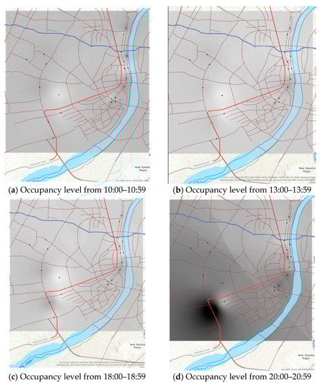 First, the spatial traffic congestion in each different time frame is shown via occupancy. In terms of spatial analysis, inverse distance weight (IDW) interpolation among measurement points is used. Therefore the occupancy or congestion spatial level does not present the real traffic congestion condition. In the case of detailed congestion analysis, it is necessary to compare with all related road measurement. The GIS tool in this research is ArcGIS and ArcGIS Pro from Esri (Environmental Systems Research Institute). Figure 10 shows four different hourly traffic congestion conditions by occupancy level between 0% and 60% occupancy from white to a dark color. From Figure 10d, the most congested area is near the CCTV No. 2 location. The subsequent Discussion section describes a detailed congestion analysis, especially at the CCTV No. 2 location.