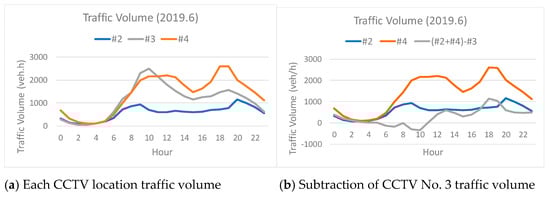 In Figure 12a, each traffic volume of CCTV No. 2, No. 3, and No. 4 is shown. When the traffic volume of CCTV No. 3 is subtracted from the total accumulated traffic volume of CCTV No. 2 and CCTV No. 4, the traffic volume curve (= No. 2 + No. 4 − No. 3) means the total traffic volume condition at the center among CCTV No. 2, No. 3, and No. 4. From Figure 12b, there is a large difference in traffic volume conditions at 10:00 and 18:00 to 20:00. These traffic volume changes cause traffic congestion conditions in the evening. From this analysis, some number of vehicle coming from CCTV No. 2 and No. 4 in the evening seems to stay around this location. There is no other information from this observation but it should have some reason for the evening traffic congestion. It is necessary to have on-site observation in future.