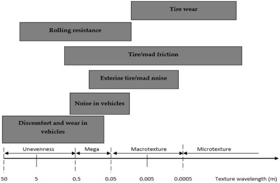 The pavement texture is defined as the deviation of a pavement surface from a true planar surface, caused by the random arrangement of the surface elements and their superficial roughness []. The texture of the pavement and its interaction with the tire can have desirable and undesirable outcomes, ranging from a high skid resistance (desirable) to discomfort and wear in the vehicle (undesirable). These effects mainly depend on the wavelength range of the texture, as shown in Figure 1. The International Standards Organization (ISO) [] identified the different orders of the texture of a road pavement: