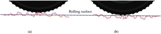 With a focus on the asphalt concrete surface of roads, the pavement’s texture appears to be a crucial aspect that can be controlled by the type and sizes of aggregates, type of asphalt binder, and through the laying processes. Control of these variables can increase friction, reduce water spray and splash, and abate noise. Following the surface texture description, pavement roughness can be divided into four texture wavelengths: unevenness, megatexture, macrotexture, and microtexture []. Each range interacts with the vehicle and its tires in a different manner. However, macro and microtextures are the most relevant ones, since they have the strongest influence on noise and friction. A higher macrotexture with similar microtextures has a greater influence on the friction than surfaces with similar microtextures and lower macrotextures []. Pavement surfaces with the same macrotexture and microtexture can also differ due to the spatial distribution of the particles in reference to a baseline. The literature shows that pavements with a positive texture (more peaks) usually have higher noise levels than those with a similar macrotexture but arranged in a negative manner (more valleys) [,].