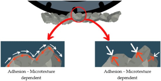 In theory, the available skid resistance is given by the frictional forces developed at the tire-road interface, which are partially governed by the surface properties of the pavement (e.g., the texture and its level of contamination) []. Moreover, the geometrical dimensions and the aggregates’ source are relevant properties, as far as skid resistance development is concerned. This is because the aggregates’ mineralogy can affect the resistance to polishing (hence the aggregate’s microtexture). It should be recalled that the microtexture of the surface aggregates and the overall macrotexture is directly related to the two main components of the friction, which are hysteresis and adhesion, as represented in Figure 4 [,].