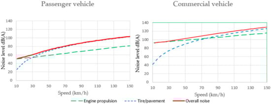 According to the Imagine-Project [], tire-pavement noise is the most relevant component of overall traffic noise at speeds over 40 km/h, as represented in Figure 5. The overall noise is mainly given by propulsion and tire-pavement noises, which are both speed-dependent, but tire-pavement prevails at speeds over 30 km/h for car traffic and for trucks when their speed is above 75 km/h [].