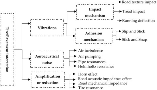 The tire–pavement interaction related to noise consists of three main generation and amplification or reduction phenomena. Vibrational mechanisms are deformations related to impact and tire rolling, mainly on the hysteretic component, and adhesion mechanisms are mainly related to the adhesion component of the interaction. They are highly dependent on the tire characteristics, as well as the pavement material and texture. The aeroacoustics depend mainly on the geometry of the tire-pavement contact and the number of air voids. The amplification or reduction also depends on the geometry and the mechanical and acoustic absorption properties of the pavement. For instance, to reduce the tire tread impact noise generation, a lower layer stiffness can be achieved by means of asphalt rubber or rubberized asphalt. Similarly, aggregate selection can be targeted to improve the microtexture, thus addressing the noise generation mechanisms related to surface adhesion (e.g., the stick and slip and the stick and snap).