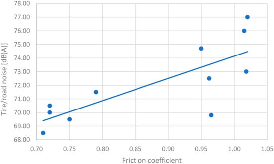 Noise level versus friction coefficient on a dry pavement (adapted from []).