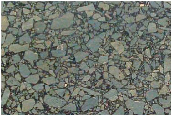 Stone mastic asphalt (SMA) was developed in Germany in the 1960s as a solution for paving heavily trafficked roads. The asphalt layer has a high content of coarse aggregates, which forms a gap-graded, skeleton-like stone structure [], as shown in Figure 8. SMA has a low air void content. However, it can mitigate the noise pressure levels up to 2–3 dB(A) [,], with typical values ranging from 76 to 80 dB(A) []. The selection of an appropriate aggregate size is crucial to achieving consistent noise mitigation. SMA has good behavior regarding friction, with values ranging from 50 up to 65 BPN [].