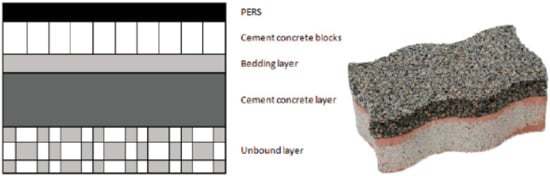 Porous elastic road surface (PERS), Figure 9, is made with rubber, usually from scrap tires, and it has a 20–40% air void content. The rubber content comprises about 20% of the volume of the total mix. This pavement type is still experimental, and more research is required to confirm its performance in terms of durability and safety [,,]. However, as it has a low stiffness modulus and is highly porous, it can effectively mitigate noise, achieving results that can potentially reach differentials up to 10 dB(A) [,]. Studies conducted by Goubert [] and Ejsmont et al. [] stated that the noise reduction could be as high as 12 dB(A), and the skid resistance was around 60 BPN, which was acceptable. However, more studies should be conducted to assess the skid resistance values’ consistency [].